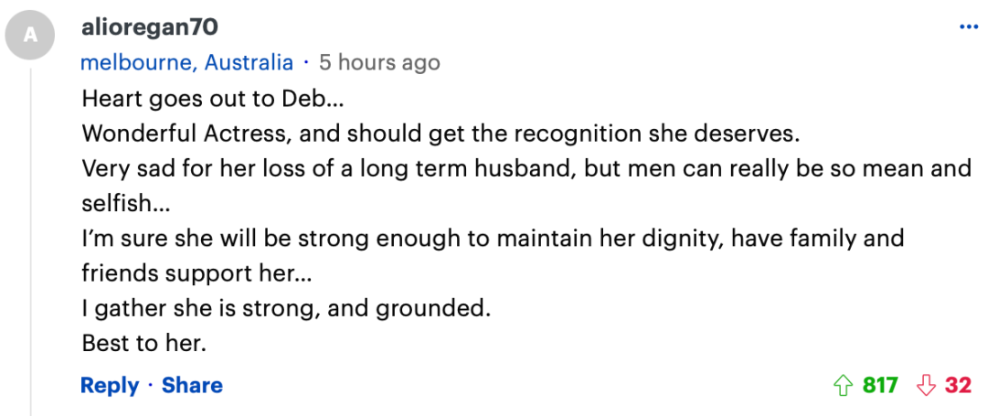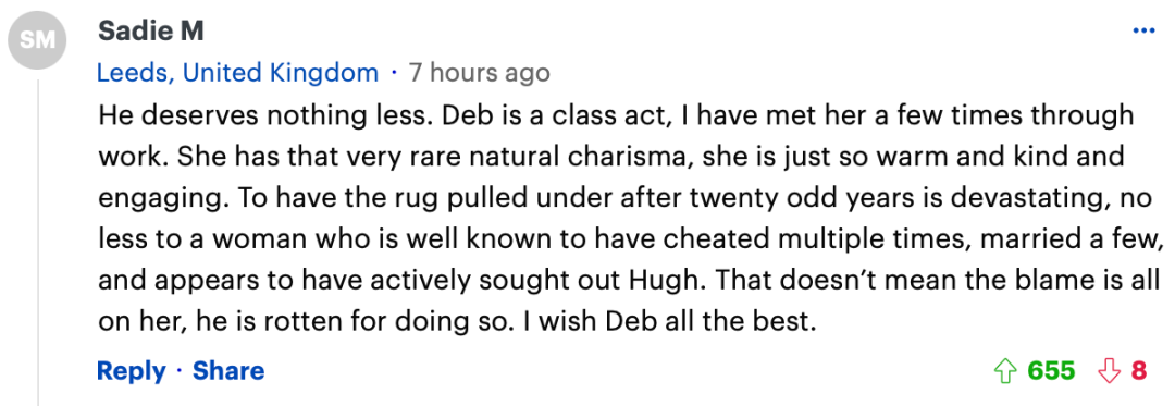 “他值得好的。Deb 是一位优秀的演员,我通过工作见过她几次。她拥有非常罕见的自然魅力,她是如此的热情、善良和迷人。二十多年后被拉下马是毁灭性的,对于一个众所周知多次出轨、结过几次婚、似乎积极寻找休的女人来说更是如此。