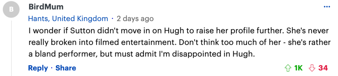 “我想知道莎顿是不是为了进一步提升她的知名度而接近 Hugh。她从未真正进入过电影娱乐界。别太看重她——她是一个相当平淡的演员,但必须承认我对 Hugh 很失望。”