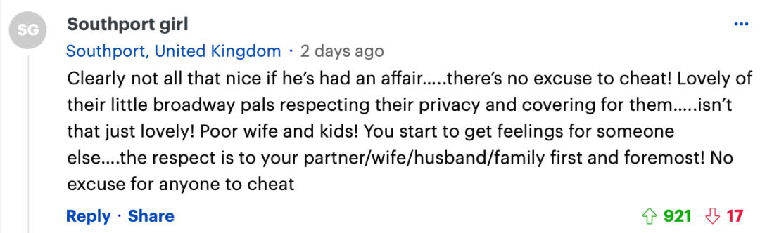 “如果他有外遇,显然他就没那么好了……没有理由欺骗!他们的百老汇小伙伴们尊重他们的隐私并为他们掩护,这很可爱……这不是很可爱吗?可怜的妻子和孩子!你开始对别人产生感情……尊重意味着首先要尊重你的伴侣/妻子/丈夫/家人!任何人都没有理由欺骗。”