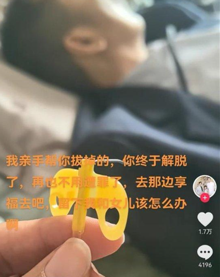 17日下午,妻子“小雨点妈妈”在抖音账号上含泪发布讣告,写道:“我亲手帮你拔掉的,你终于解脱了,再也不用遭罪了,去那边享福吧!”她还在视频中展示了丈夫治疗时的画面,并表达了自己深深的不舍和痛苦:“你丢下我和女儿,我和女儿没有家了,该怎么办?”