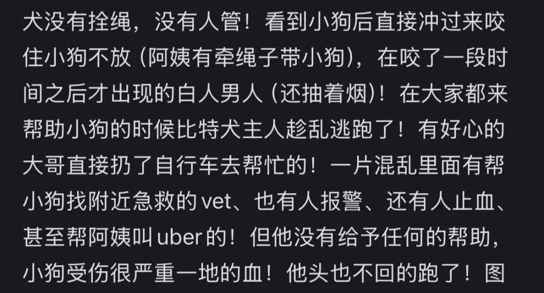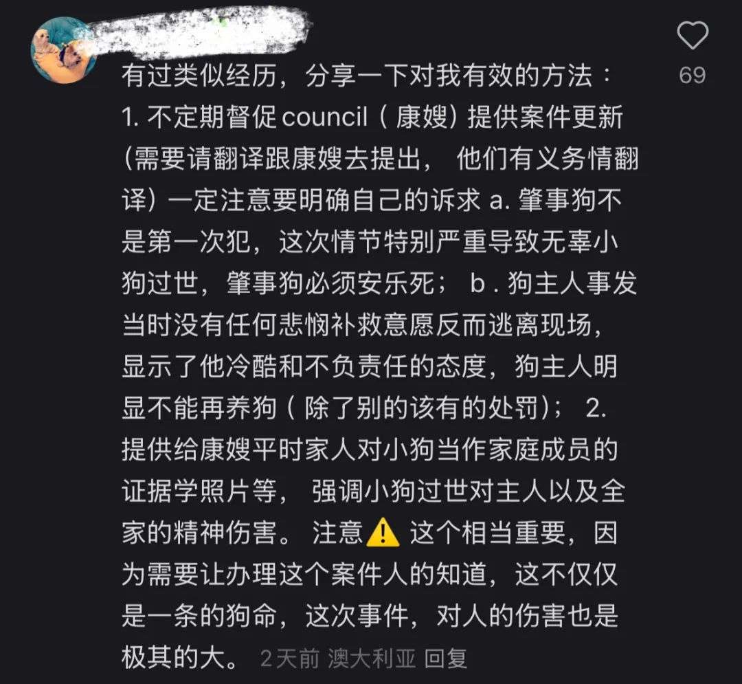案发当天,抹茶在主人的牵引和陪伴下像往常一样在熟悉的街道上散步。然而,天降横祸,一只没有牵引绳的斗犬突然冲出来撕咬完全没有防备的抹茶, 伤势过重的抹茶在抢救无效后不幸死亡。后经证实,这名恶犬的主人是一个当地的流浪汉,且在事发过程中并没有第一时间出现制止,还企图趁乱逃走。调取录像显示恶犬的主人在“救下”抹茶后,将其随手扔在了其主人的脚边!而让人震惊的是,在评论区里,曾受到此恶犬威胁的受害者竟然不止一个。这起恶劣事件发生后,有很多目击者,在现场伸出援手,事后也都表示愿意向警方作证,抹茶的主人在案发后的第二天在网上宣布了这个不幸的消息。愤怒被推向了顶点, 网友们齐声怒喊“不能放过恶狗”、“一定要举报”等。希望抹茶妈妈能讨回公道的网友们纷纷出谋划策,只为实现“恶有恶报”。这种斗犬因发达的肌肉、敏捷坚毅的个性而被人们培育,最初进行残暴的格斗活动。后经改良有所缓和,但对其从小的安全训练要求很高,不建议在城市里饲养。此外,人们对狗袭击事件再度得到重视,担心类似事件是否会发生在自己身上。据澳洲邮政今年9月的数据,在过去5年中,南澳的狗袭击邮递员事件增加了50%。这促使当地州政府针对此出台了新法规,若自家宠物狗袭击了他人,狗主人将会面临高达10万澳元的罚款和监禁。小微整理了新闻报道以及海内外的文章进行了以下总结:当被狗袭击时,首先保护好头部、脸部的身体重要部位,通过采取用深色衣物蒙住狗头、提起狗的项圈来勒紧狗脖子使其前脚离地等方式让狗松口。当然最好是始终与陌生犬类保持安全距离,防患于未然。SBS中文网针对宠物狗袭击事件表示,袭击事件发生后,需要遵循所在州的法律规定,当地政府不能要求法院命令事件负责人向受害者支付罚款。且一般来说,地方政府很少下令毁灭袭击人的宠物狗。但就此次抹茶被恶犬袭击的事件中,因众多网友在评论区举报该恶犬曾多次袭击过路人和其他宠物,因此当地政府有权利下令毁灭袭击犬。因此,当遇到狗袭击事件,切记要及时上报council。呼吁所有养狗人,为了保障自己和他人的安全,一定要在遛狗时握紧牵引绳!最后,让我们在“抹茶”的头七这一天再次表达缅怀之情,愿天堂没有痛苦…