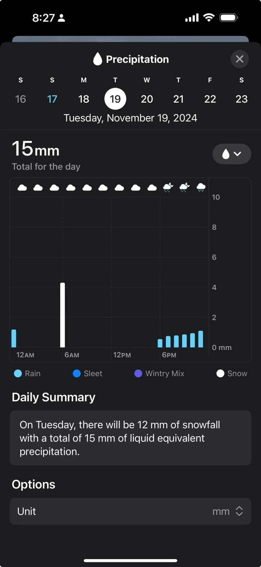 预报称:“降雪量将达到12毫米,液体当量降水总量将达到15毫米。”