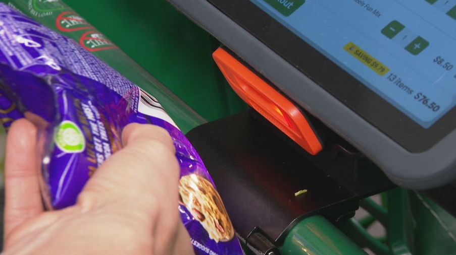 顾客使用自己的账户解锁平板电脑,然后将其夹在购物车上,这样就可以一边购物一边扫描产品,结账时一键结算。