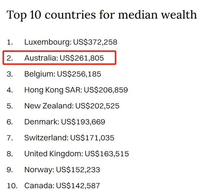 据统计,澳洲平均家庭净财富已经超过百万,达到158万澳元,人均财富增长近10%,是瑞银56个样本国家增长率的两倍多,并根据人均财富中位数排名,澳洲荣获第二,仅次于卢森堡!