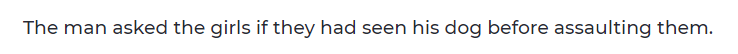就是这么简单的一句话,瞬间就激起了两个孩子的爱心,她们开始跟着这个陌生男人的后面,一起寻找所谓的狗狗....
