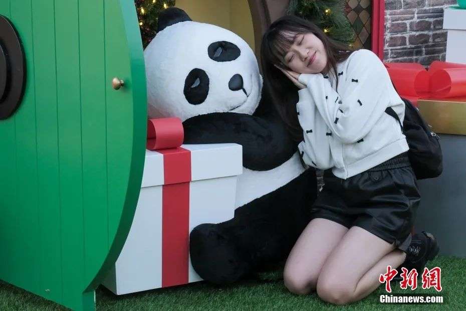 图为香港旅游发展局呈献年度盛事“香港缤纷冬日巡礼”,市民与圣诞小镇内的大熊猫合照。陈永诺 摄