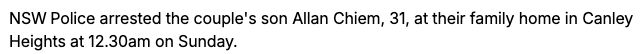 经过多方面调查,新州警方于周日凌晨00点30分左右在Canley Heights的一处住宅中逮捕了死者31岁的儿子Allan Chiem,并将其带到Fairfield警察局。