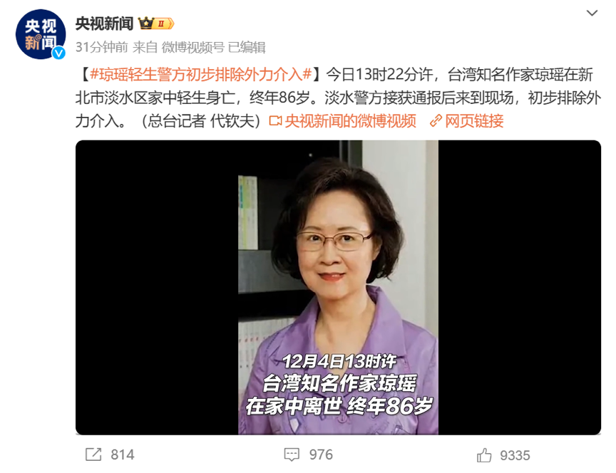 据央视新闻报道,12月4日13时22分许,台湾知名作家琼瑶在新北市淡水区家中去世,终年86岁。