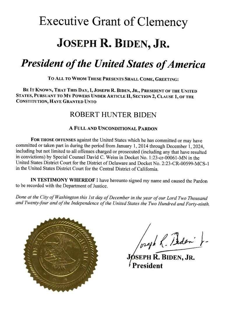 周日,拜登正式签署行政赦免令,对亨特在 2014 年 1 月 1 日至 2024 年 12 月 1 日期间犯下的、可能犯下的或参与的违反美国法律的罪行进行完全无条件的赦免。