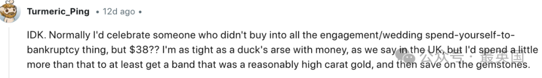 我也不知道该怎么说。一般情况下,我会赞扬那些不陷入婚礼和订婚这种“把自己花破产”的套路里的人,但38美元?我们英国有句老话,我对钱可是抠得像鸭屁股一样紧,但我至少会多花点钱,买个还算高纯度的金戒指,然后在宝石上节省。