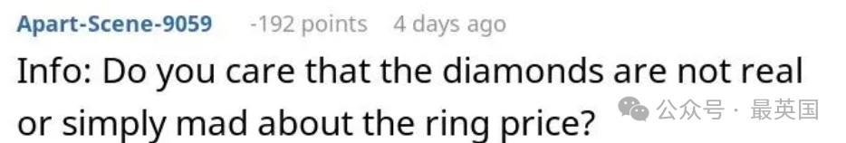 他们的争论愈演愈烈,男友甚至生气地反问:“你觉得我是什么样的人?是个吝啬鬼吗?骗子吗?你竟然这么看我?”但即便如此,男友依然没有解释为什么会选择这款戒指。