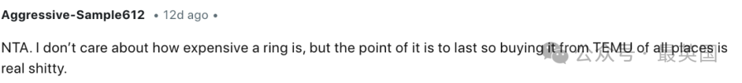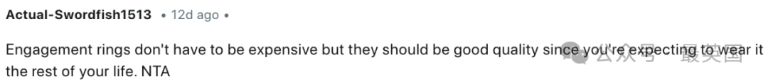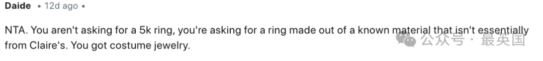 NTA(你没有错)。你又不是在要一个价值5000美元的戒指,你只是希望戒指是用一些像样的材料做的,而不是类似Claire’s那种劣质货。你现在戴的就是一件廉价的饰品罢了。