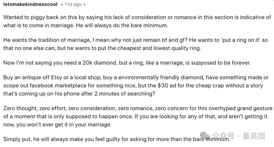 “爱情的确无价,但这个戒指实在有点儿让人失望,”妹子在帖子中说道。她也坦言自己失眠了好几晚,不知道该不该对男友说,她不想要这个戒指……