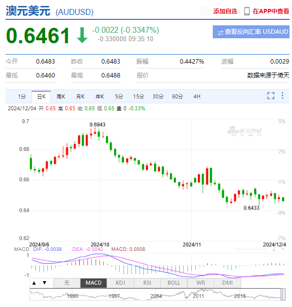 澳元兑美元汇率也几乎一直在下降趋势中。