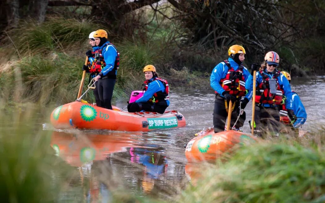 潜水员顺着Halswell河向湖边方向搜查,地勤人员分散在围场和河岸上,对水道进行探测,同时一架直升机升空。