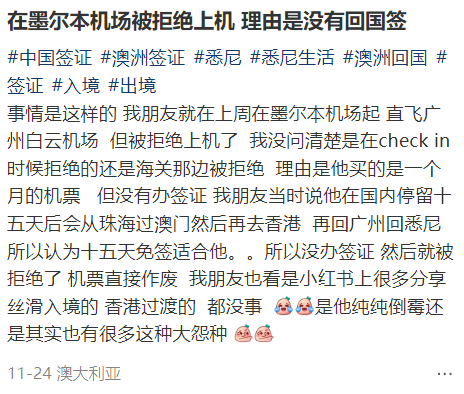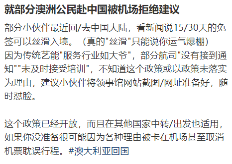中对澳试行部分免签政策后,不少澳籍华人都能更方便的回国。但是最近有网友分享,明明有免签政策,却被拒绝登机?
