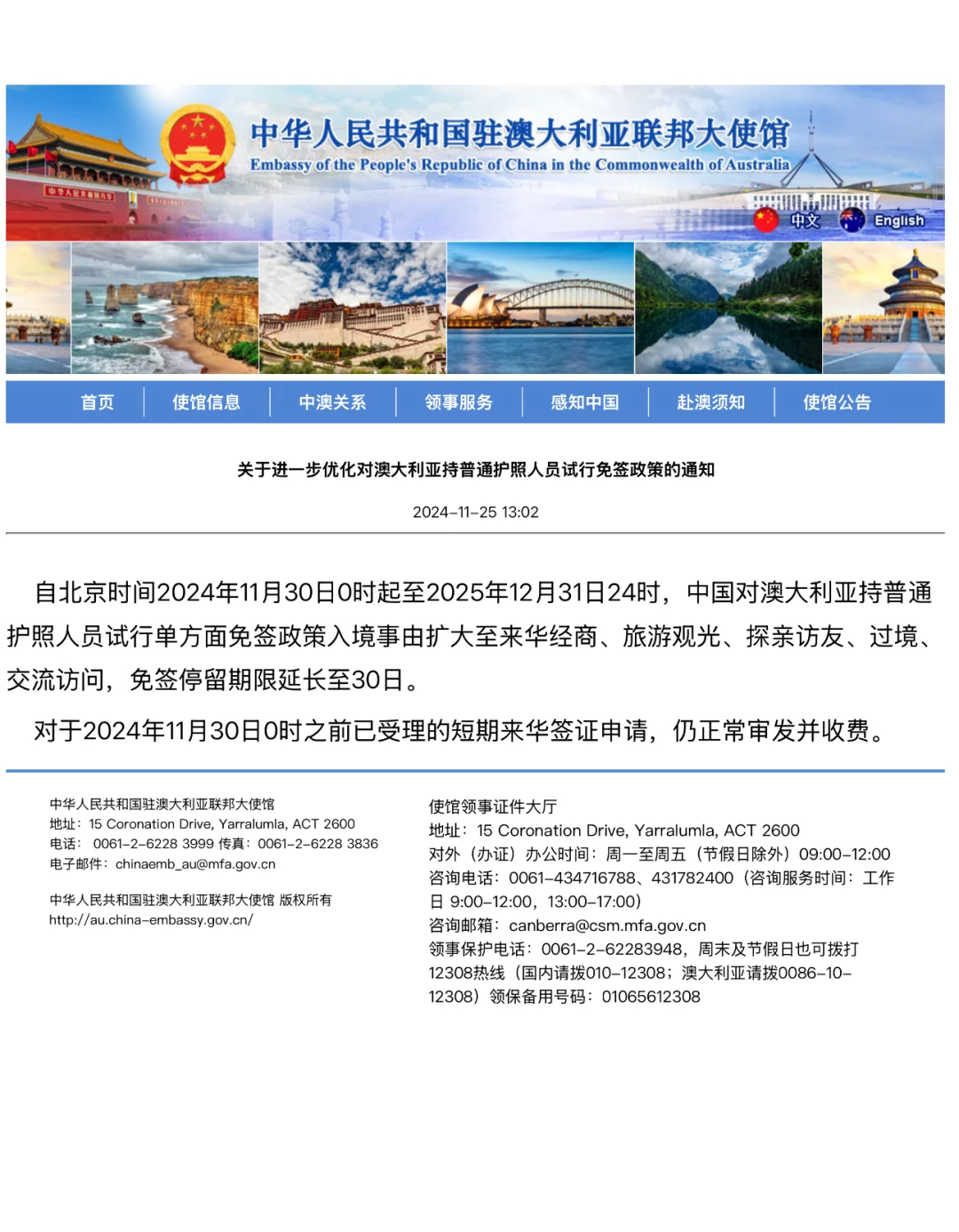 11月30日起,包括澳洲38个免签国家在中国逗留时间被延长到30天。