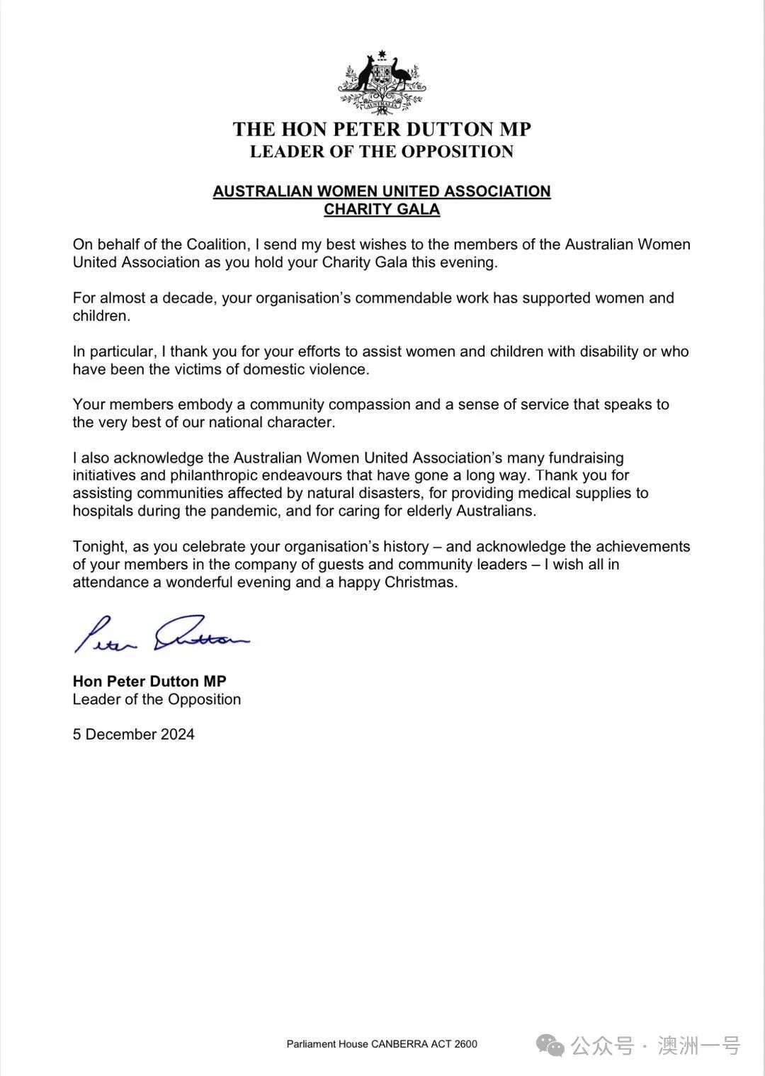 晚宴吸引了众多政界和商界人士的关注和支持。澳洲影子党领袖Hon Peter Dutton MP特别发来祝贺信,对澳大利亚妇女联合会近十年帮助妇女儿童弱势群体,积极筹款捐助公益、服务社区表示感谢,祝愿晚宴圆满成功举办。新州议员Mark Coure MP、新州前上议员兼AWUA荣誉会长何沈慧霞博士(Dr. Helen Sham-Ho OAM)、新州前议员John Sidoti、自由党联邦Bennelong选区候选人Scott Yung,以及澳洲国际安居服务(SSI)女性权益研究政策主管Dr. Astrid Perry OAM等政要亲临活动,助力公益。