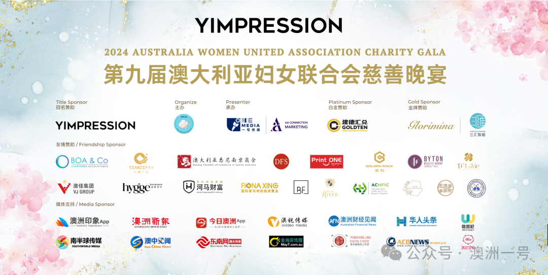 感谢BOA Financial Group Pty Ltd、天禧汇安TIANZIPAY、悉尼印象 、Print ONE 、ST IVES FLOWER VILLAGE、河⻢财富、澳洲晴润文化集团、澳中⼤健康产业商会的友情赞助。