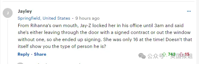 “据蕾哈娜亲口所说,Jay-Z 把她锁在办公室直到凌晨 3 点,并说她要么带着签好的合同从门口离开,要么不签合同就从窗户出去,所以她最终签了合同。