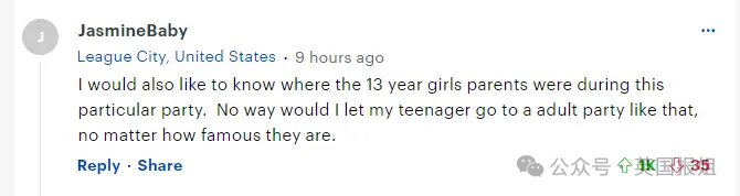 “这名13岁女孩的父母当时在哪里?无论如何我也不会允许我家小孩做这种事情的,无论对方多有名。”