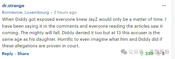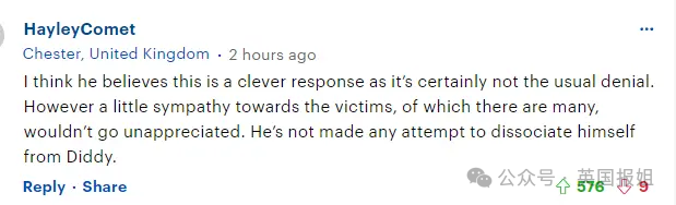 不过,要是他能对受害者表现点同情(毕竟受害者不少),大家可能会更能接受。至于他,并没有做出任何与Diddy划清界限的举动。”