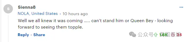 “我们大家早就知道会有这么一天…我真受不了他和碧昂丝——期待看到他们垮台。”