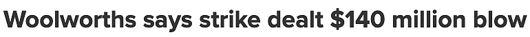 Woolies在声明中指出:“罢工导致的食品销售总额损失约1.4亿澳元(截至12月8日)。自12月3日至今,损失又增加了约9000万澳元。”