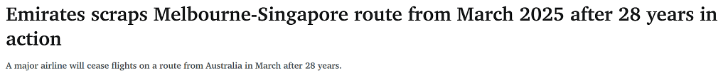 《广告人报》12月9日报道,在9月份透露将停飞已运营28年后的新加坡来往墨尔本航线后,阿联酋航空(Emirates)终于宣布,将从2025年3月30日起取消该航班服务。