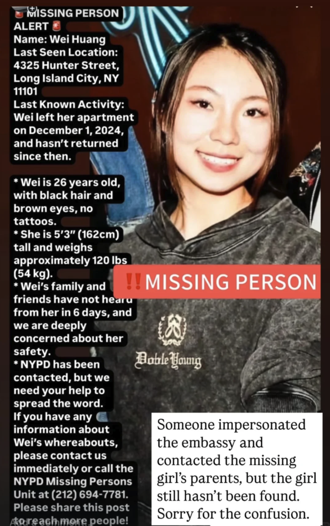 黄蔚最后一次被目击是在 11 月 30 日,当天她离开了位于纽约 Long Island City 的 Hayden LIC Apartment。失踪时,她身穿黑色夹克,黑色长发,身高约 162 cm,无纹身或明显标志。