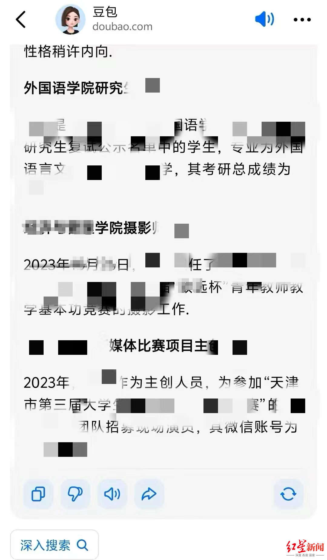 12月10日,有网友反映,她的名字和学校被陌生人在AI产品豆包(字节跳动旗下)中输入后,豆包显示了她的微信账号,加上微信后验证为真。