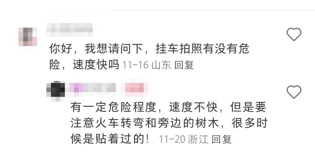 在社交平台上,不少博主分享了自己“挂火车”的自拍图。当网友问及“如此拍照有没有危险”时,一位博主直言:“有一定危险,速度不快,但是要注意火车转弯和旁边的树木,很多时候是贴着过的!”