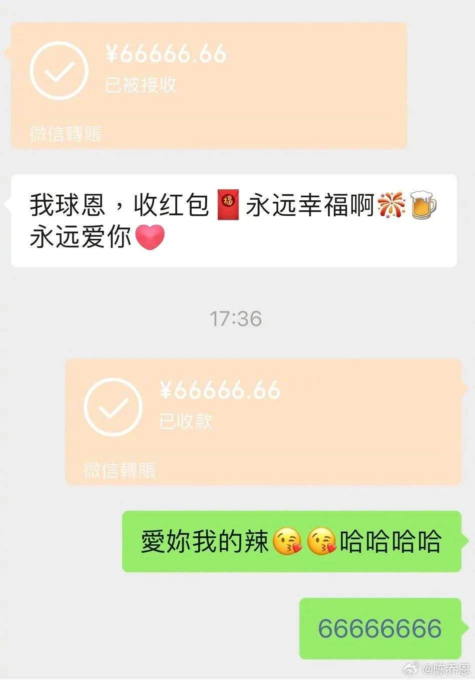 陈乔恩还晒出聊天记录,谢娜给了她66666.66元红包,并表示:“我的球恩,收红包,永远幸福,永远爱你。”