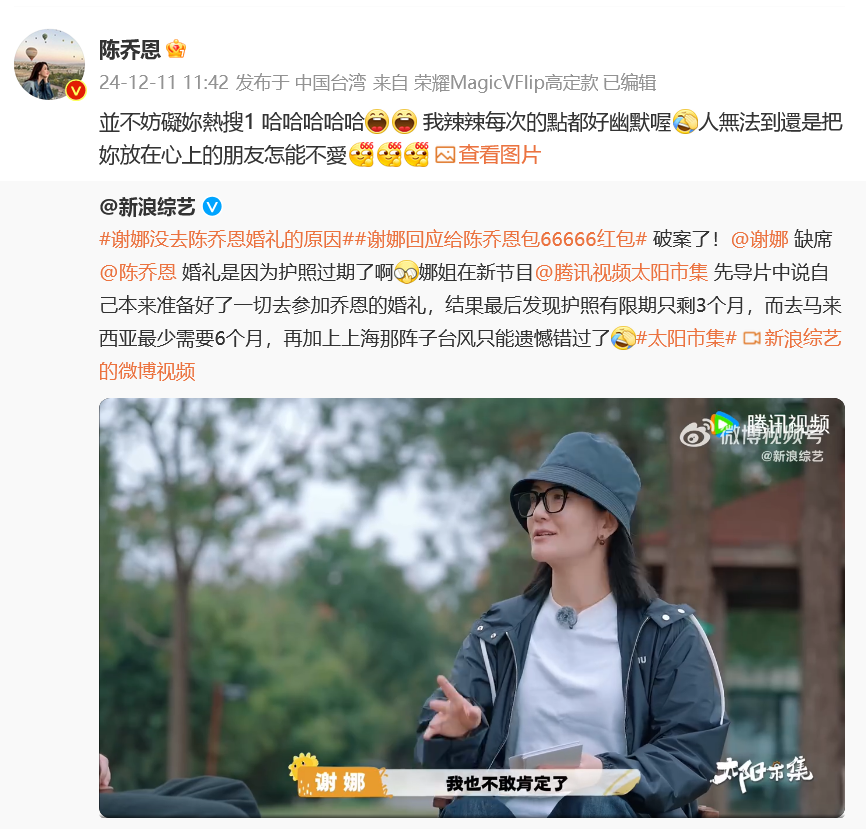 12月11日,陈乔恩转发谢娜提到红包的视频回应:“并不妨碍你热搜1,哈哈哈哈哈。我辣辣每次的点都好幽默喔,人无法到还是把你放在心上的朋友怎能不爱?”