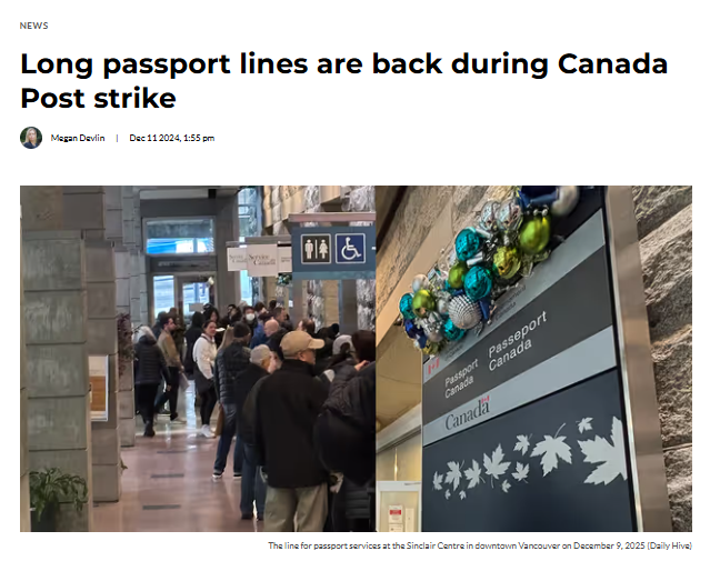 许多人前往办公室更新他们的申请,改为亲自领取,以避免在邮政罢工期间申请被扣留数周。加拿大人通常可以邮寄护照申请,然后在家中收到文件。但这种省心的选项目前不可用。