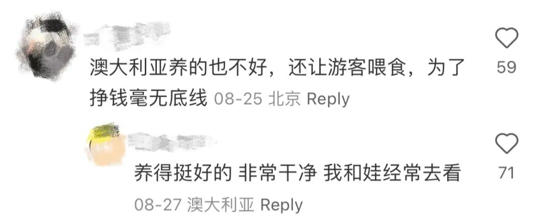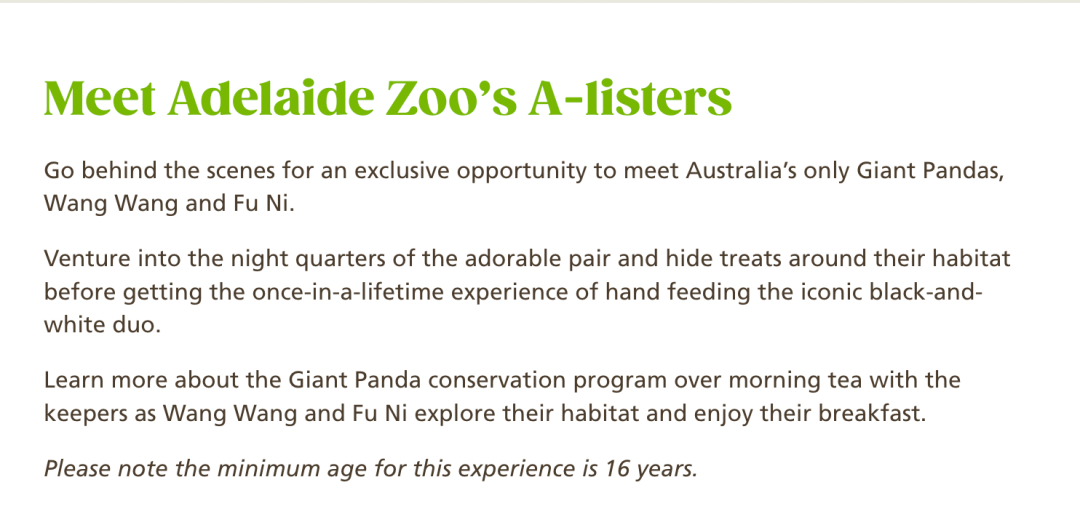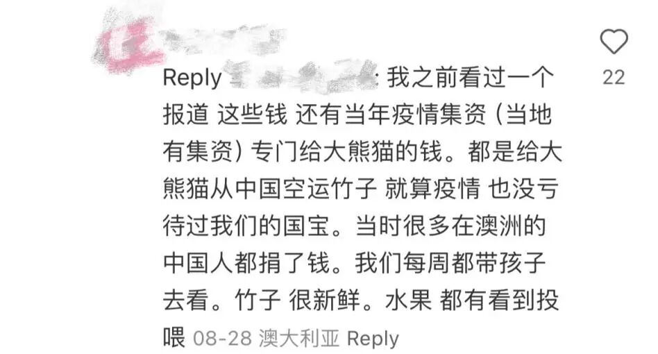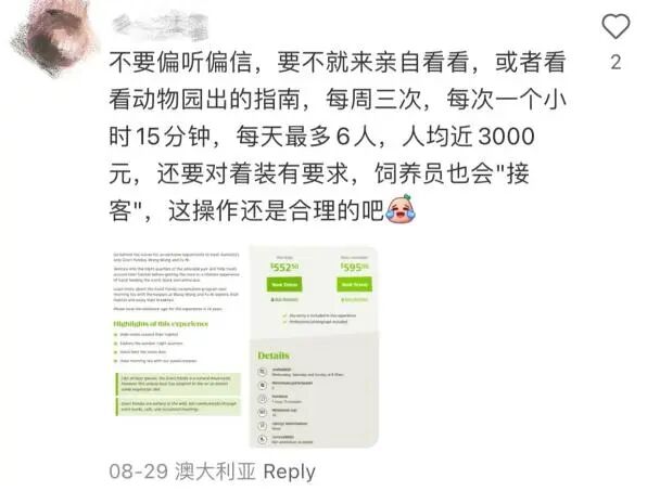 星秋和怡兰今年都是三岁,星秋是只非常帅气的雄性熊猫,性格温顺。“星星之秋”的名字描述了他的出生季节以及他出生之夜闪烁的星空。而怡兰是一只雌性美熊猫,活泼可爱,名字的意思是“闲适幸福”。英英1991年出生,1992年被救助,2023年7月离世,共育有9胎14仔,存活13仔。星秋的妈妈是英英的幺女淑琴。淑琴小名“雪晴”、“四胖”,现居住于四川卧龙山中华大熊猫苑神树坪基地。怡兰则来自水秀家族,是野生大熊猫水秀的外孙女,野生二代怡畅妹妹的女儿。华人网友们最操心的问题,就是这些“熊”孩子们在外面过得好不好。在阿德莱德动物园的官网上,我们发现,可以预约喂食大熊猫。实地观赏过的网友则回复到“养得挺好的,非常干净。”“场馆内很多管理员,看到一个白女开闪光灯,还被请出去了。”甚至有人说,澳洲一直从中国空运竹子给熊猫,即使疫情期间没钱也要集资买竹子,从没亏待过咱国宝。有细心的网友拿出截图,动物园指南上明确规定了和大熊猫们见面需要预约,每周三次,每次仅一个小时15分钟,每天最多6人。有图有真相,网友纷纷返图在阿德莱德见过的网网和福妮。“养得还行啊,环境也好。。。拉出的屎及时清理,环境卫生,该玩的,该有的全都有。”“凡是去看过的,都说不出批评的话。室外更美,而且是分别有室外空间。”“有一说一,等他们回国了还不知道养老的地方有没有现在的房子好呢,现在整个动物园就属他俩的别墅最大,室内外还有小花园流水,别的狮子啥的空间那叫一个小。”而这次3岁的中国大熊猫“星秋”和“怡兰”抵达澳洲后,澳洲各地华人还争起来了:去SA谁会去看。为啥𣎴去GC, syd, melb 旅遊区啊。这个假期,有计划去阿德的伙伴,记得去看看“星秋”和“怡兰”吧!