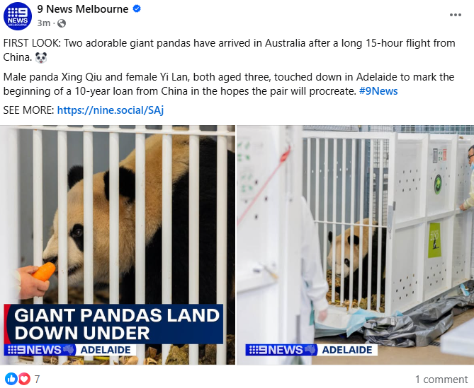大熊猫将在阿德莱德动物园隔离 30 天,直到 1 月中旬,希望能正式接待游客。