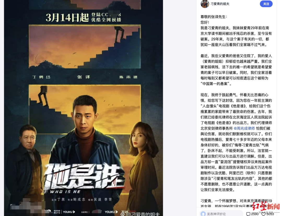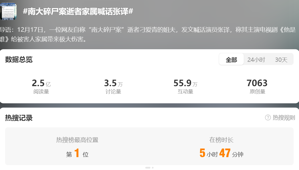 12月17日,“南大碎尸案”被害人刁爱青的姐夫发文喊话演员张译,称其主演电视剧《他是谁》给被害人家属带来极大伤害。多个相关话题冲上热搜。