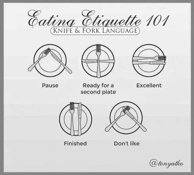 当你吃完后,要把餐具放在“完成”的位置(餐具并排放置)。
