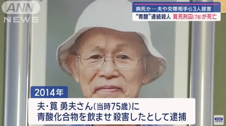 日本法务省26日宣布,臭名昭著的“黑寡妇”笕千佐子(Chisako Kakehi)于当天在大阪拘留所离奇病逝,享年78岁。