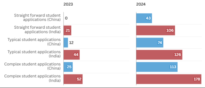数据显示,在2023年的学生签证申请处理中,印度学生的签证处理时间普遍长于中国学生。尤其是在复杂类别的申请中,印度学生的处理时间几乎是中国学生的两倍。