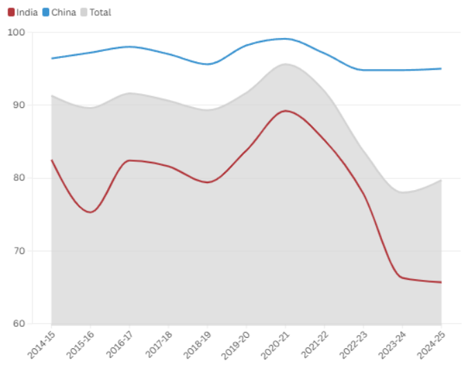 其中,印度学生的签证通过率从疫情前的近90%下降至65%,而中国学生的签证通过率则始终稳定在约95%的高水平。