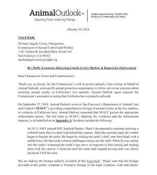旧金山市动物控制和福利委员会主席迈克尔·安杰洛·托雷斯(Michael Angelo Torres)在接受采访时表示,他支持立即采取措施停止这些市场中的不人道行为,并且应加强对活体海鲜市场的监管。他指出:“作为委员会主席,我无条件支持我们作为一个城市可以而且应该做的一切,立即制止这些市场的不人道行为。”