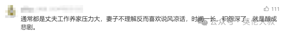 一些网友提出,这类悲剧往往源自家庭内部潜藏的矛盾与压力。他们认为,丈夫背负着沉重的工作与生活重担,而妻子却未必能够理解,甚至不时发表讽刺或冷嘲热讽的话语。随着时间的推移,这些未解的积怨不断积累,渐渐形成一种无形的压力,最终导致了无法挽回的悲剧。仿佛是一根脆弱的弦,直到最后一根弦断裂,一切都变得无法挽回。