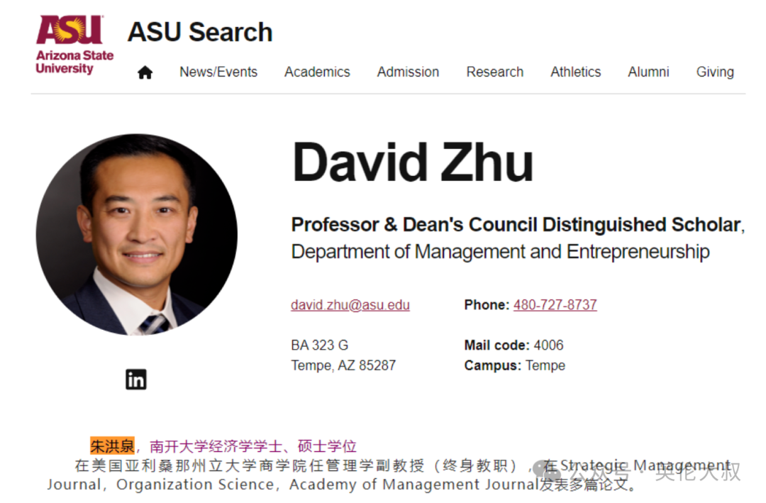 亚利桑那州立大学(Arizona State University,简称ASU)是一所位于美国亚利桑那州的公立研究型大学,成立于1885年。根据大学的员工简介显示,朱洪泉是管理与创业系的“教授兼院长委员会杰出学者”,已经在那里工作了10年。