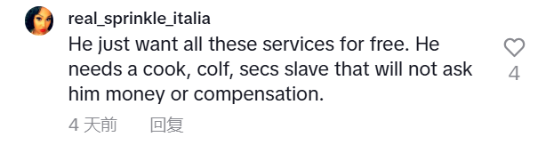 他只是想要这些免费的服务。他需要一个不会向他索要金钱或报酬的厨师、服务员和保姆。