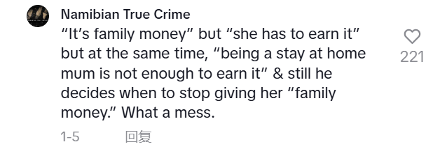 “这是家里的钱”,但“她必须自己挣”,但与此同时,“做全职妈妈还不足以挣到这些钱”,但他仍然决定何时停止给她“家里的钱”。真是一团糟。