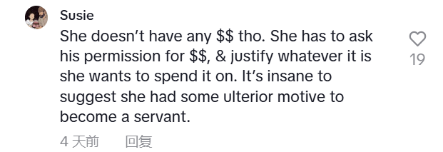 她没有钱。她必须征得他的同意才能花钱,并且要证明她想把钱花在什么地方。说她别有用心要当仆人,这简直是疯了。