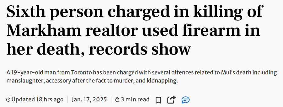 在备受关注的安省万锦华人地产经纪梅玉英(音译,Yuk-Ying "Anita" Mui)遇害案中,第六名嫌疑人被控“使用枪支”致其死亡,法庭记录显示,警方正在调查受害人与嫌疑人之间可能的联系。