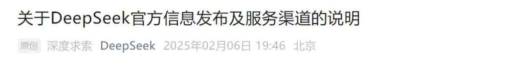 文中提到:近期注意到部分与DeepSeek有关的仿冒账号和不实信息对公众造成了误导和困扰。为保障用户权益,减少虚假信息的不良影响,我们现就官方账号等问题说明如下↓